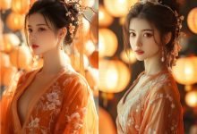 左边为即梦的生成效果,右边为Midjourney的生成效果,你觉得哪个更好呢? 中文提示词:一位身着传统宋代服饰的美丽女子,站在无数灯笼的背景下,周围是流动的橙色丝绸。场景沐浴在柔和的光线中,散发出浓厚的节日氛围。照片采用佳能EOS R5相...