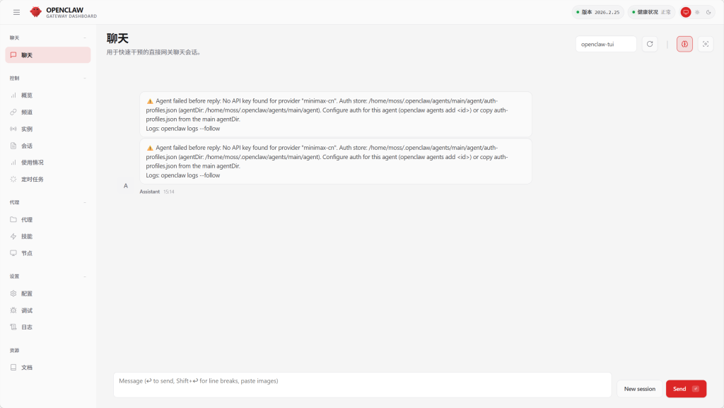 最后在本地终端中,运行openclaw dashboard,本地打开web ui访问