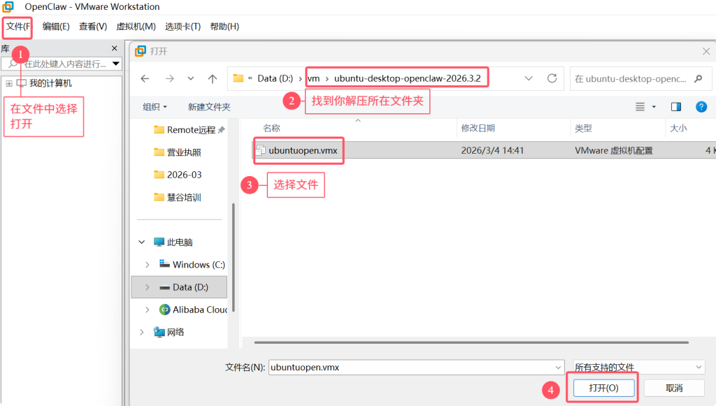 第三步:在VMware中,点击文件选项——点击打开,选择第一步解压保存的文件夹,找到.vmx文件;