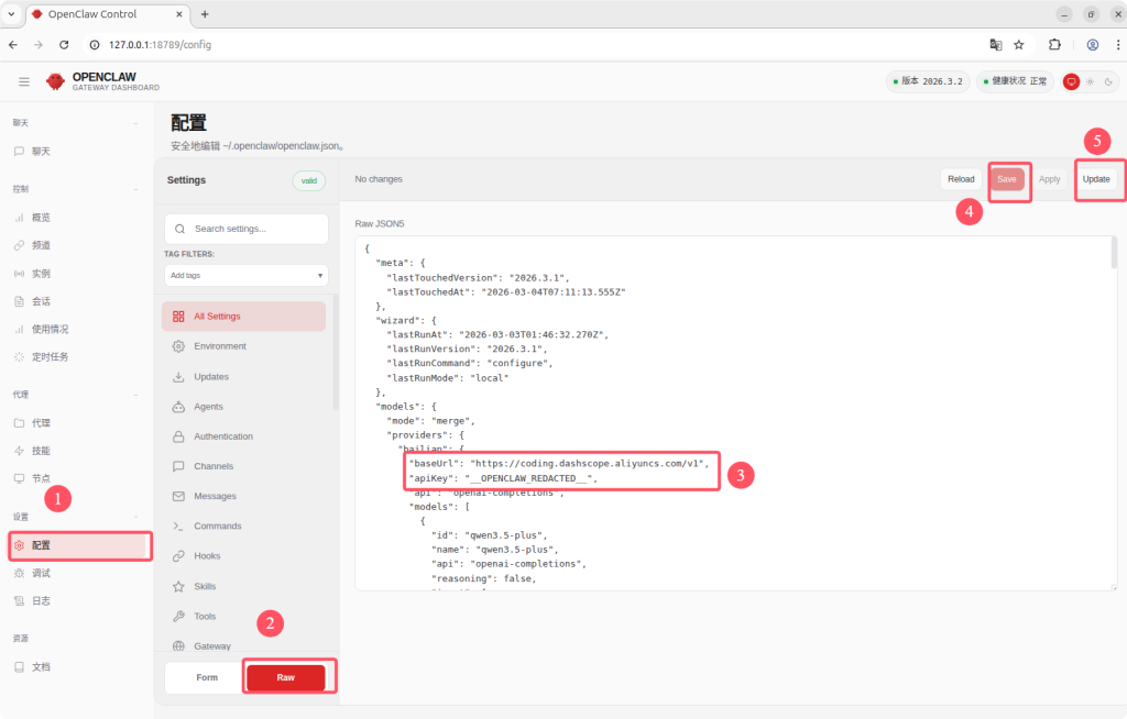 配置好apikey后,一定要保存并UP,然后重启一下网关(在终端中执行:openclaw gateway restart)