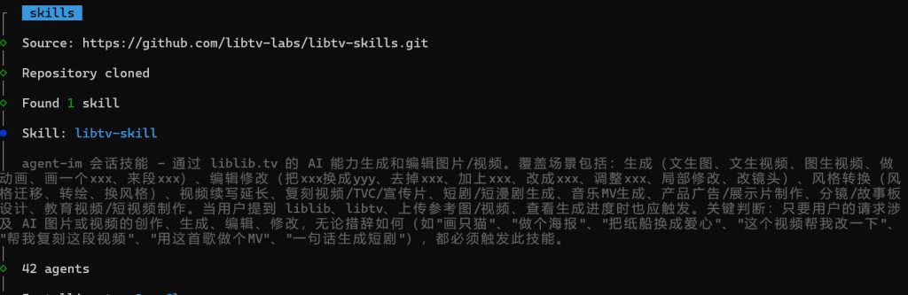 libTV,是 LiblibAI 全新推出的视频平台,libtv-skills呢,就是libTV打包好的,专门让Agent调用的。