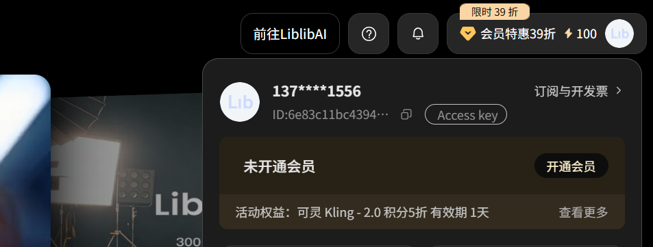 libTV官网(https://www.liblib.tv/),登录账号,鼠标移到右上角头像,点“Access Key”。