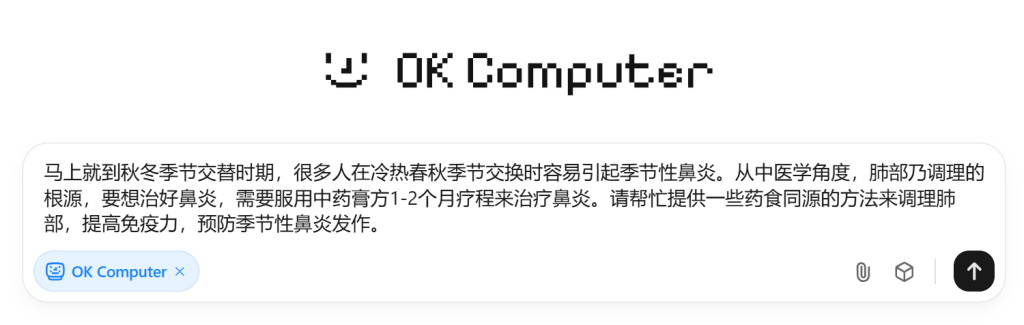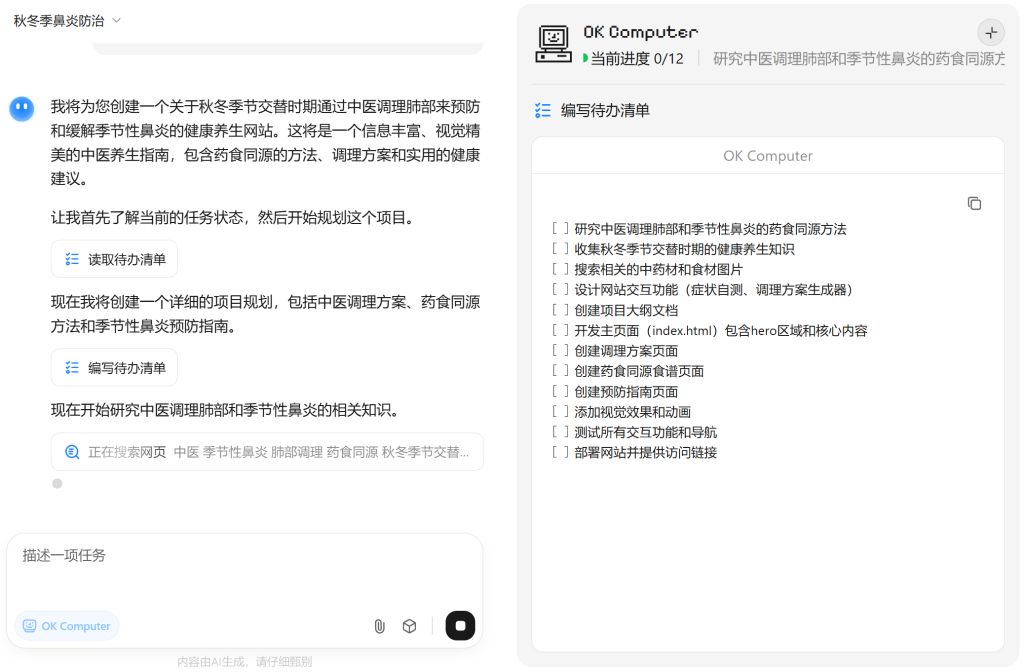 OK Computer 号称是你的“AI 产品和工程团队”,本质上是一个大号的 AI Agent:你给它一个需求,它给你一个成品。