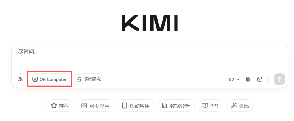Kimi官网地址:https://www.kimi.com,注册登录后,就能在对话框里面看到Ok computer的按钮,如果你申请了深度研究的内测,还会多出来一个深度研究。