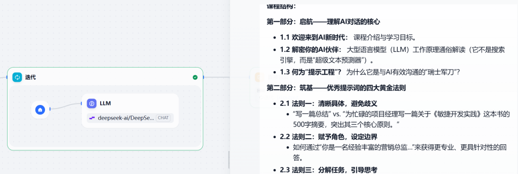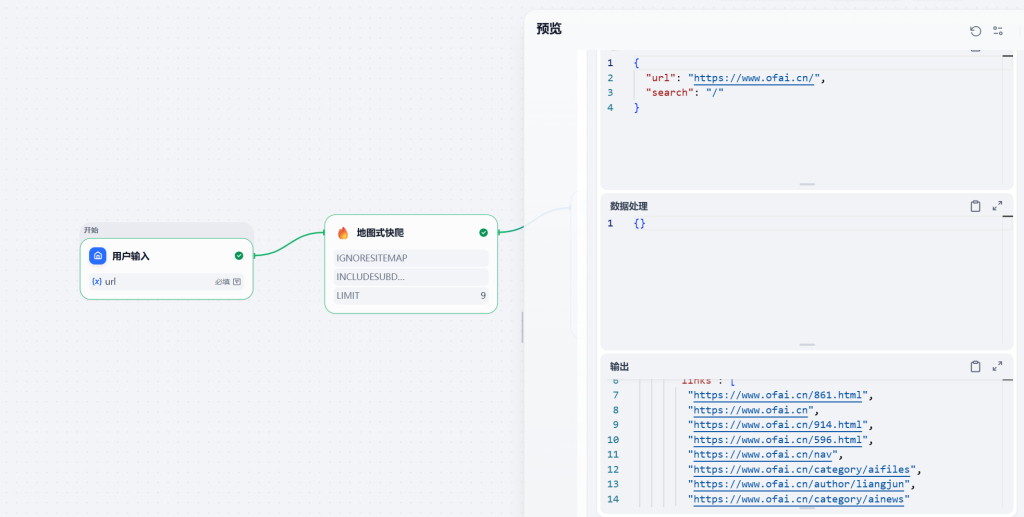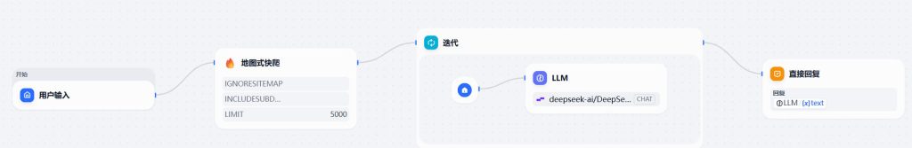 开始节点 – 页面抓取 – 迭代节点(LLM节点) – 输出节点。